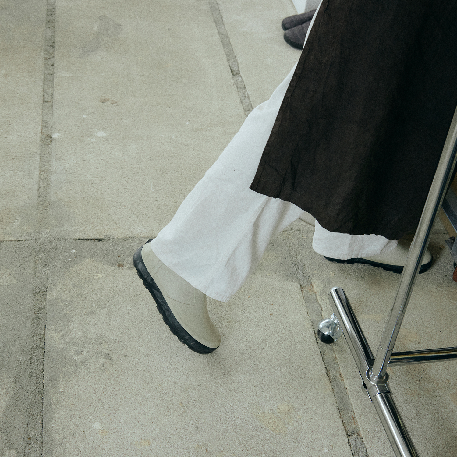 元々はデイリーユースとして使っていたMARKEは、染色した布を洗ったりと水場の作業も多く現在はアトリエで履くことが多いと言う由紀さん、立ったり座ったりの動作の中で、柔らかくフィットする履き心地とスタイリングに馴染むシンプルさが使いやすく日常に馴染みます。