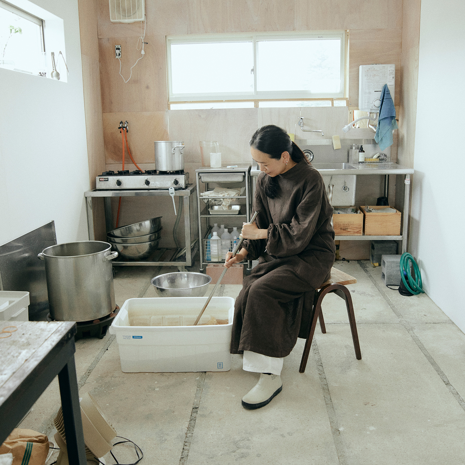 東京から⻑野県の諏訪へアトリエを移し、身近なあらゆる草木や食材の端材など天然染料で生地を染め、働く人に寄り添う衣を創作する「MARU TO(マルト)」 のデザイナー、藤解由紀(とうげ ゆき)さん。