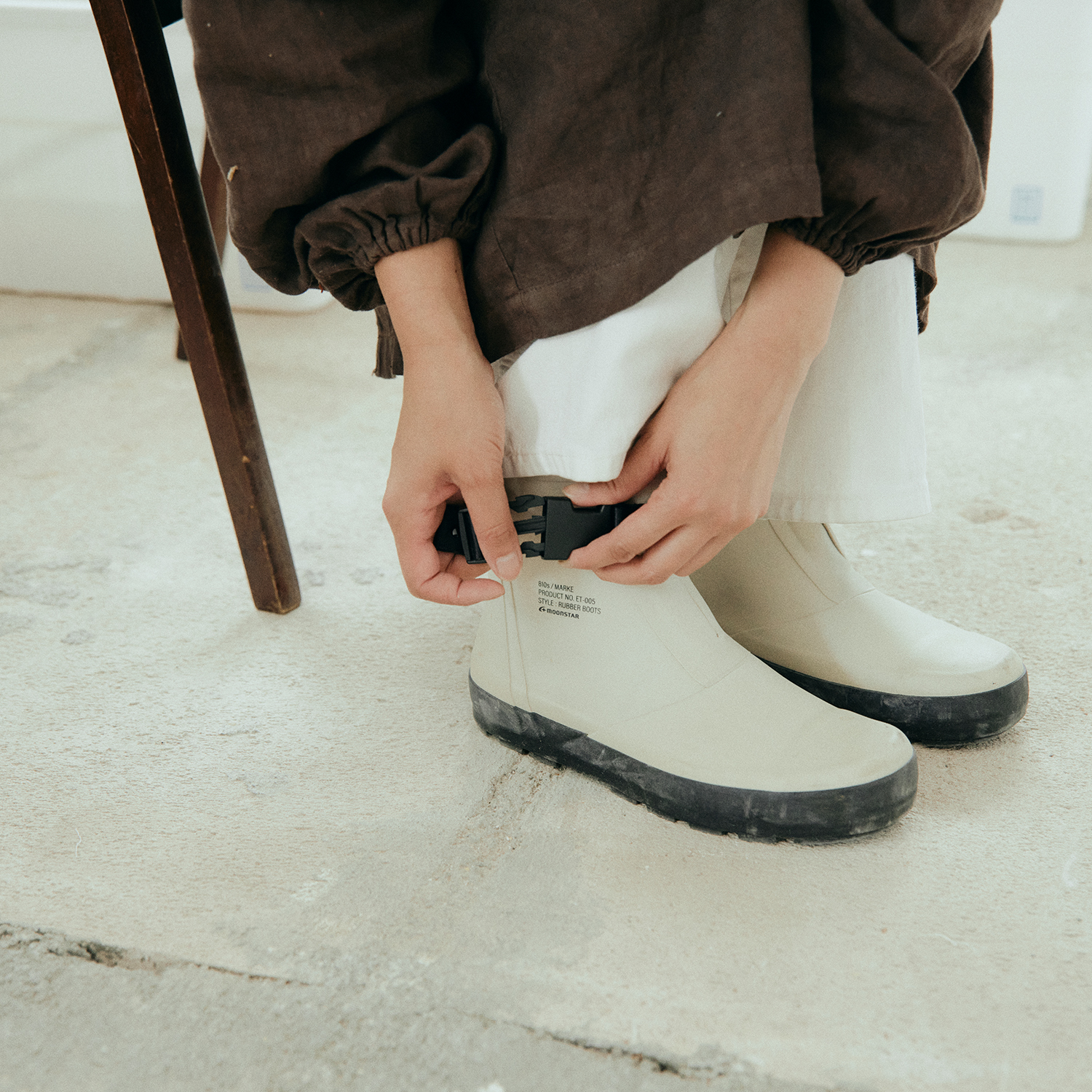 多用途の作業用ゴム⻑靴をデイリーユースに。バックル仕様にすることで着脱の容易さは保ちつつ、フィット性を高めるシルエットに。履口にパイピングを施し足当たりを軽減した仕様に改良。底面には防滑性を考慮し設計したサクション(吸盤)ソールを採用。ソリッドな印象のワークブーツタイプ。