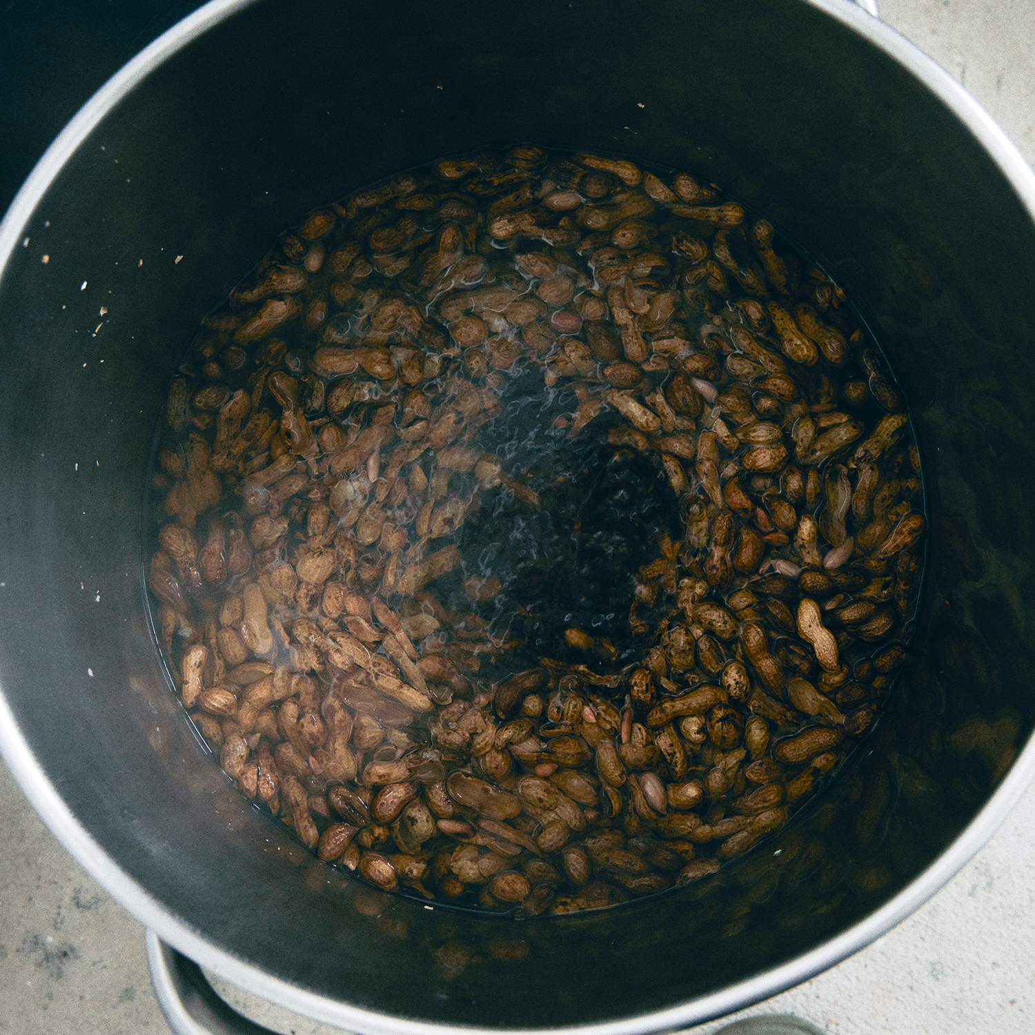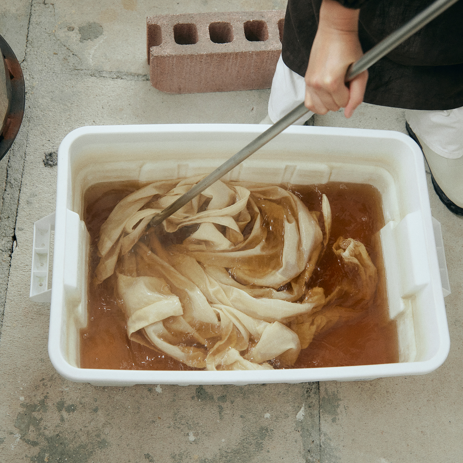 染色の工程はシンプルながら、草木などを煮て抽出した染色液に布を浸し、撹拌(かき混ぜる)しながら染め、染め上げた布を水洗いして乾燥するまでは時間を要する仕事。