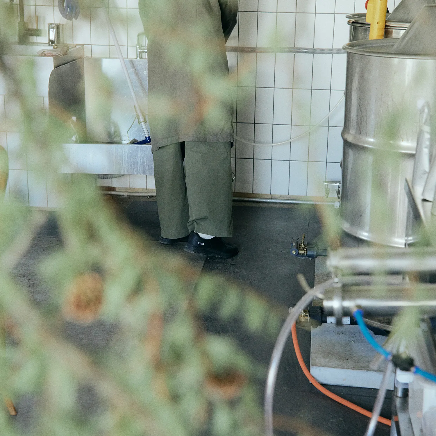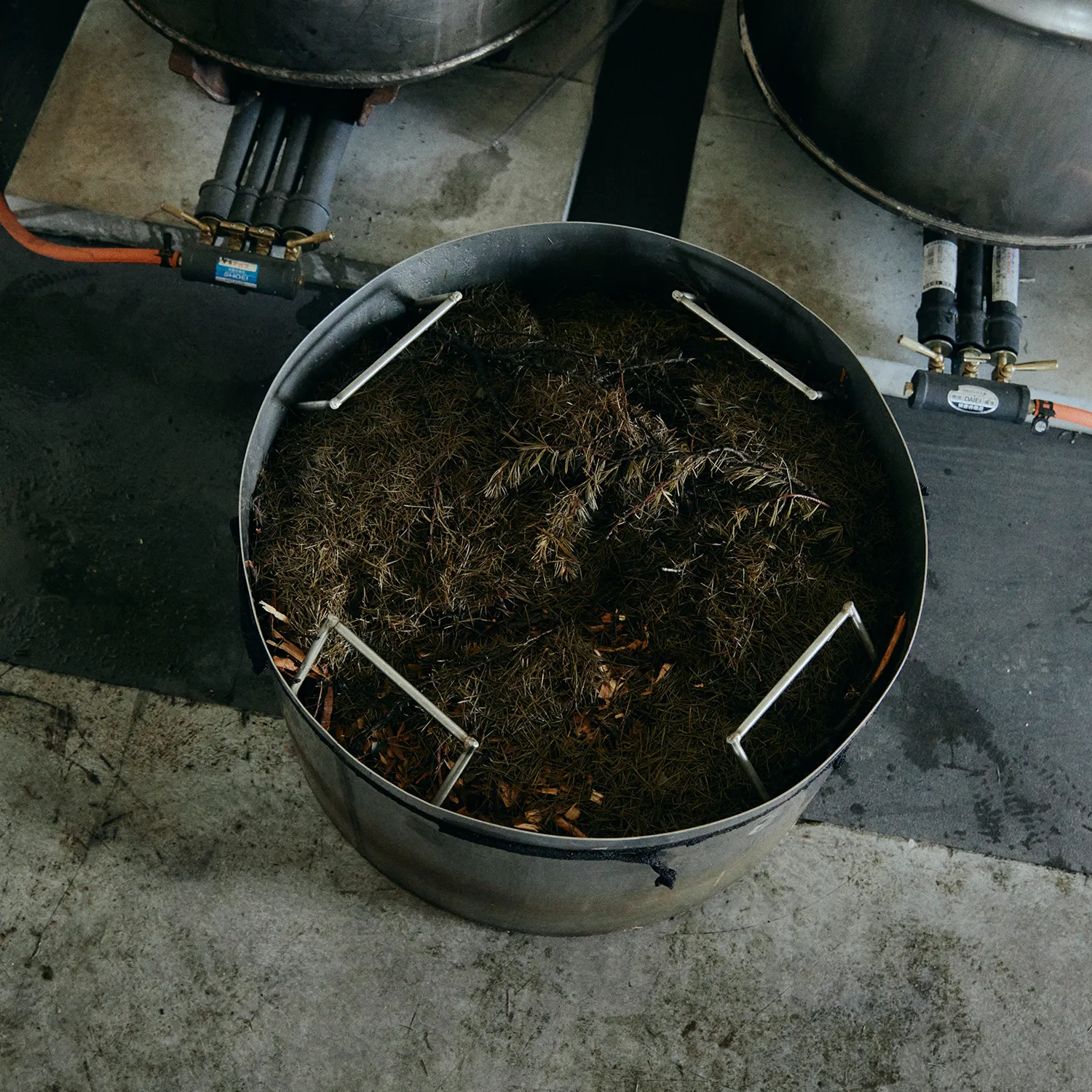 精油の蒸溜には、自社設計の蒸留器や昇降機を駆使して約5時間をかけて蒸留。樹木の場合、1回の蒸留での採油率は良くても1%前後となり、蒸留を何度も積み重ねて製品へと繋がっていくという。時間をかけてマルチバームやヘアオイル、ルームスプレーというプロダクトへ循環し「樹木」と名付けられた香りは、ウッディでどこか芯のある日本らしい香りです。