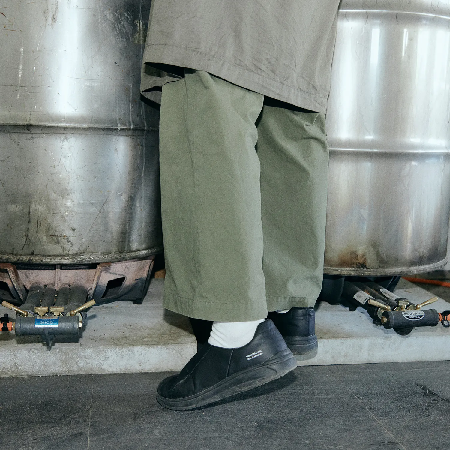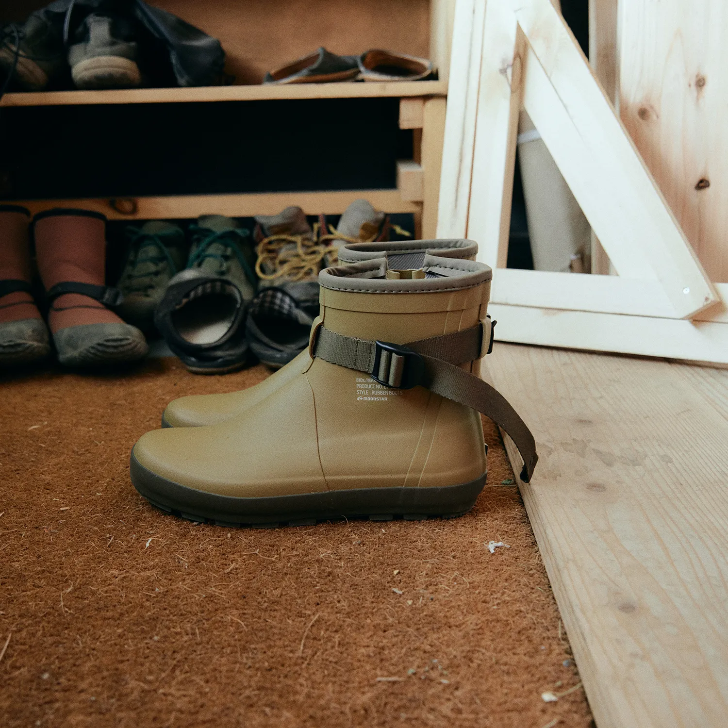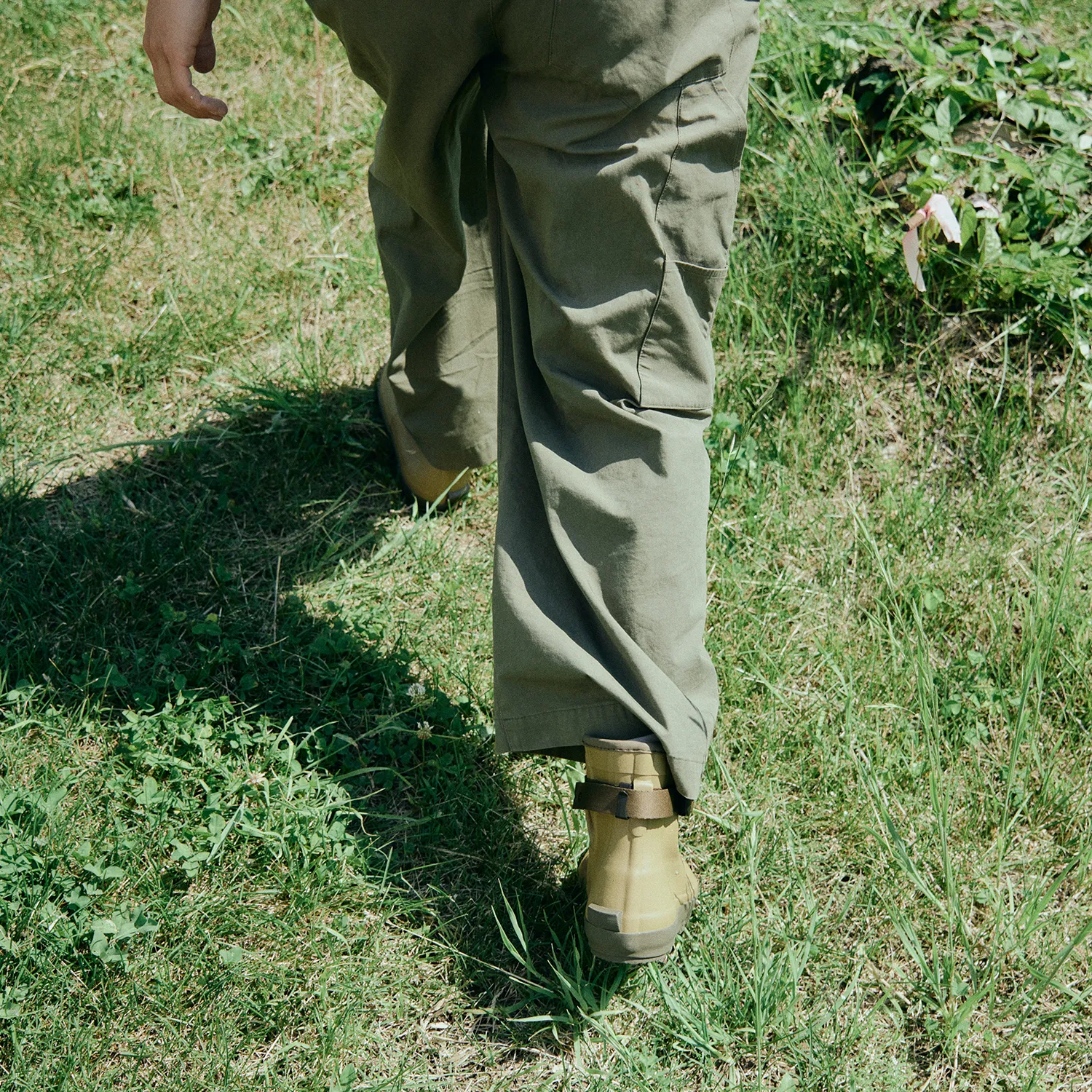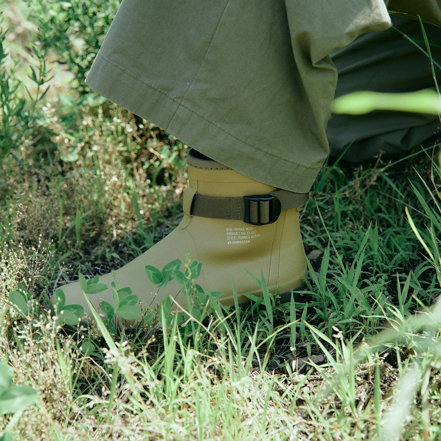 多用途の作業用ゴム⻑靴をデイリーユースに。バックル仕様にすることで着脱の容易さは保ちつつ、フィット性を高めるシルエットに。履口にパイピングを施し足当たりを軽減した仕様に改良。底面には防滑性を考慮し設計したサクション(吸盤)ソールを採用。ソリッドな印象のワークブーツタイプ。