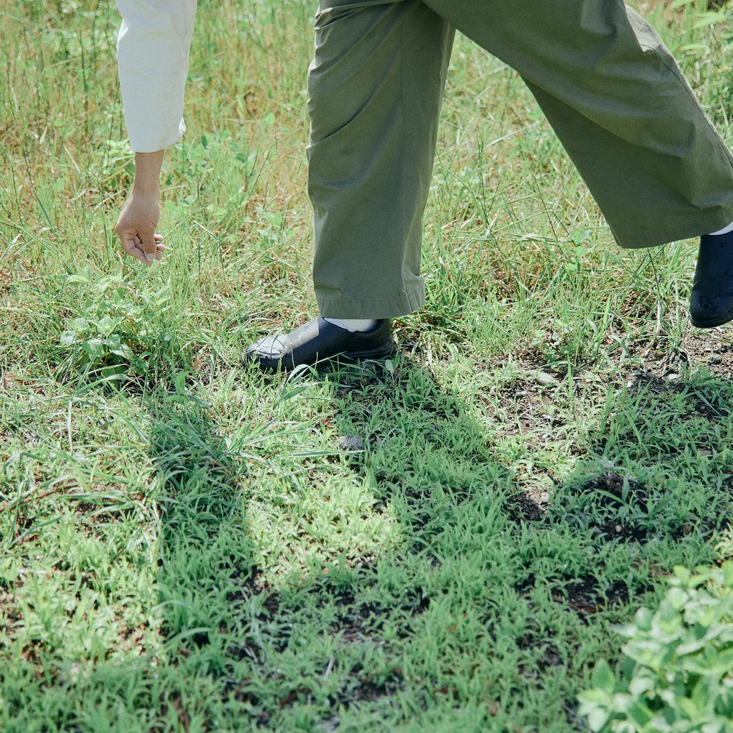 1日の中で、蒸留しながらもすぐ隣の畑でもハーブなどボタニカルを採ったり、蒸留をしながらのパッケージングや企画会議なども行う為、工房2階のオフィスとの行き来も多く、履き替えのストレスが少なく防水面が優れている810sはワークシューズとしてもちょうどよく機能します。